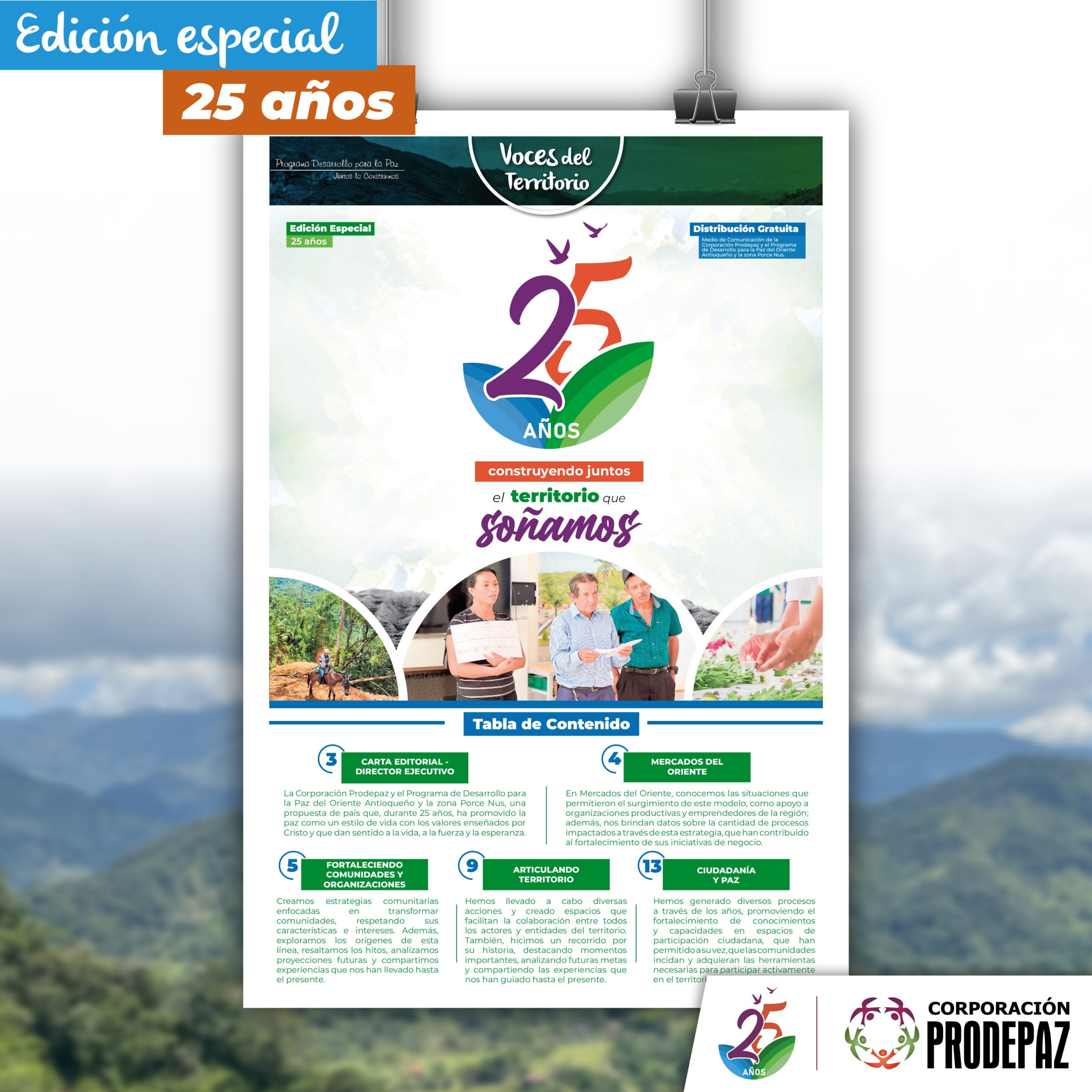 Es por esto que la publicación número 26 del periódico Voces del Territorio, en su edición especial sobre los 25 años de quehacer de la Corporación Prodepaz, está disponible para que toda la comunidad, aliados y organizaciones puedan consultarla. Este documento físico y digital responde al interés de contar nuestra historia y acciones con la comunidad dentro de las zonas de influencia durante estos años de trayectoria.