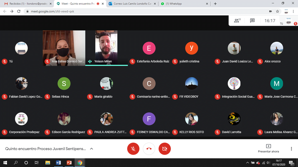 La Corporación Prodepaz realizó el pasado 7 de octubre, el quinto encuentro del Proceso Juvenil Sentipensar la Paz, evento virtual en el que participaron aproximadamente 22 jóvenes del Oriente Antioqueño y la zona Porce Nus.