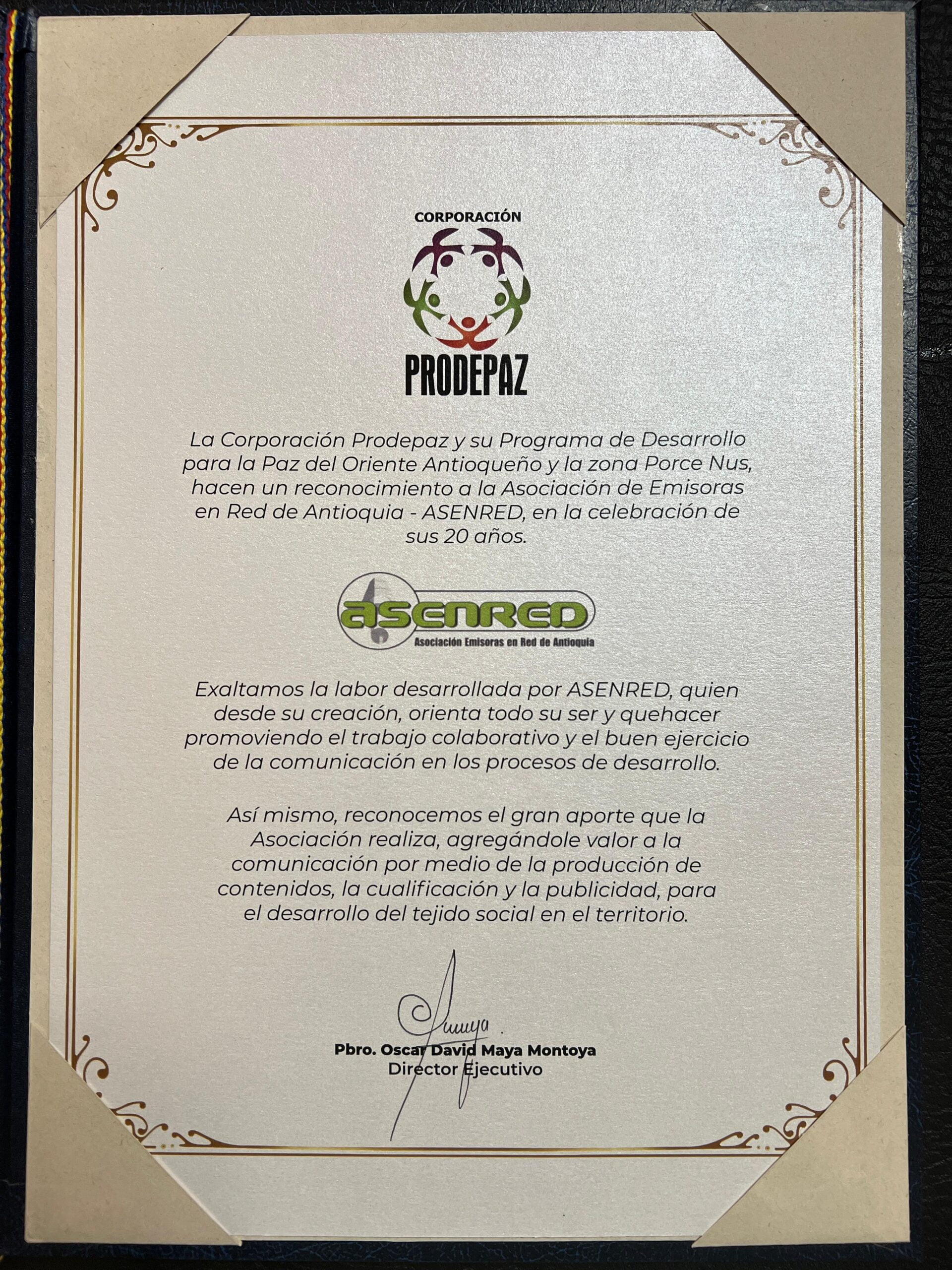 El pasado 28 de noviembre, la Corporación Prodepaz, en nombre del director ejecutivo el Pbro. Oscar David Maya Montoya, hacen un reconocimiento a la Asociación de Emisoras en Red de Antioquia – ASENRED, en la celebración de sus 20 años.