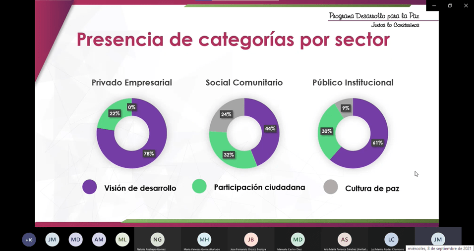 Los próximos ejercicios de socialización se realizarán de la siguiente manera: se focalizará el sector público, el 21 de septiembre entre las 10:00 am y las 12:00 m. En cuanto al sector privado, el 28 de septiembre entre las 3:00 pm y las 5:00 p.m. Ambos espacios se harán bajo modalidad virtual, por medio de la plataforma Microsoft Teams. Consulta los enlaces de acceso en nuestro sitio web www.programadesarrolloparalapaz.org.